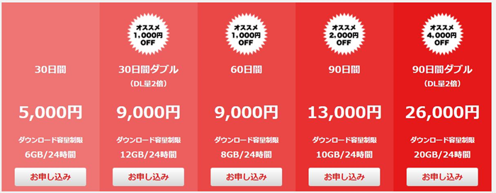 30日プランでも通常と比べると2倍のダウンロード転送量制限なので、たくさんの動画をダウンロードしたいけど、料金は抑えたい時に最適な料金プランです。